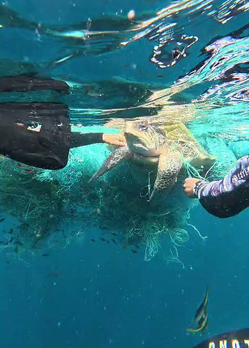 Laila Anbu is a female olive ridley sea turtle found by the Dive Nakai Maayafushi team in the middle of North Ari Atoll. She was entangled in a large ghost net, and the rescue team entered the water with knives to free her. Laila Anbu was unable to dive, and one of her front flippers was severely injured, so transport to Atoll Marine Centre was arranged via a local Manta Air flight. Upon arrival at the centre, AMC’s veterinarian assessed her injuries, collected admission data, and settled Laila Anbu into her tank to rest. After several days of stabilisation, it became clear that her injured flipper could not be saved and had to be amputated. Laila Anbu is now recovering well, and we remain hopeful that she will continue to make progress and, once her wounds are fully healed and she can dive comfortably, return to the ocean.